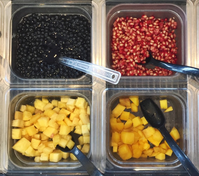 To make the original, Jim and Lisa use milk delivered from a local farm, and a plain skim yogurt from Sidehill Farm in Massachusetts. This is unlike most frozen yogurt places that typically use a standard mix because the number one ingredient of these products is sugar or water. The number one ingredient of Ayelada’s yogurt is milk. Every flavor starts with the original and then has other ingredients added to it. All of the fruit flavors are made using real fruit, which Jim and Lisa either find fresh or get using a puree from France that contains no added sugars. Some of the more exotic flavors like the pumpkin, caramel, and cinnamon are made with a rooibis tea from Tea Guys, a vendor also located in Massachusetts. In the case of flavors like cider donut and cannoli, there are literal donuts and cannoli blended into the original yogurt. Even the toppings are as natural as they can find like the hand cut fruit, local honey, and local granola.