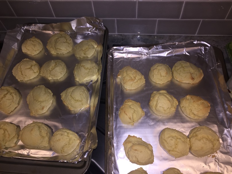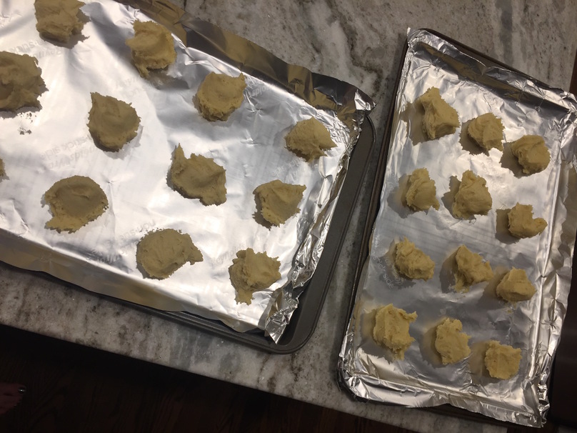 Line cookie sheet with non stick foil or parchment paper. Drop tablespoon sized dollops on cookie sheet until there is no cookie dough left in mixing bowl.