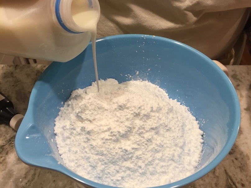 While the cookies cool, start making their frosting. Pour the milk and lemon extract into a small mixing bowl with powdered sugar.