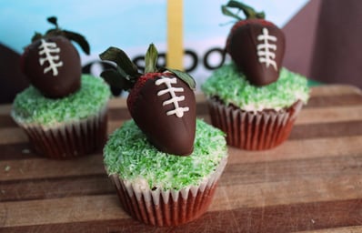 Chocolate Cupcakes with Coconut Grass and Chocolate Covered Strawberry Footballs