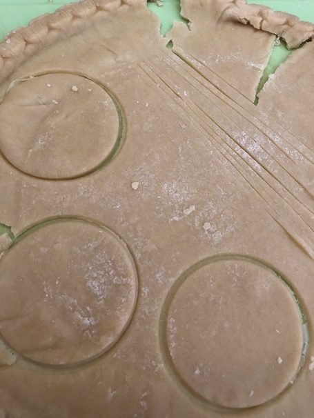 Time to prepare the mason jars. Take one of the mini jars and use the rim to cut 12 circles. Then, using a small knife, cut strips, about 1cm in width. You will need about 8 strips per pumpkin pie. Save any extra dough and set it to the side because you will need this for later. (See the end of this recipe if you would like to make the crust from scratch).