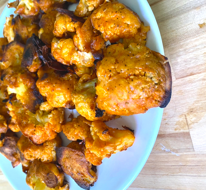 When it is a super busy week, I usually get the pre-made refrigerated Cauliflower Buffalo wings from Whole Foods and heat it in the microwave with a ranch on the side. Or if I am home and have free time, I prepare the cauliflower wings from scratch. I usually pair the wings with celery. Or I have tortilla chips and salsa/ vegan queso on the side.