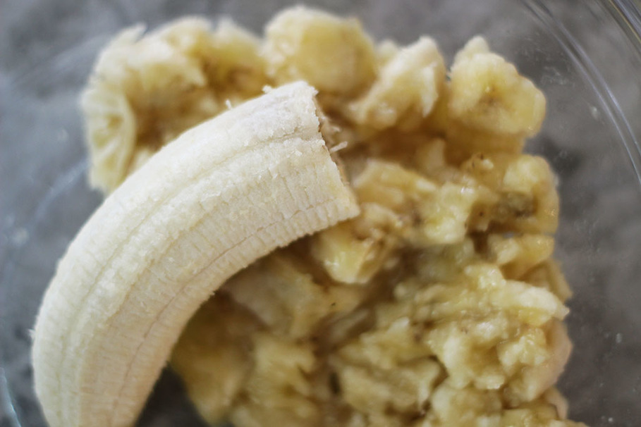 Smash the overripe bananas in a bowl with a fork.
