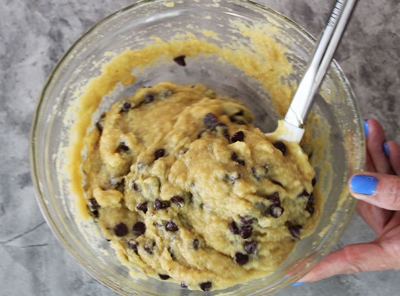 Crack the eggs and whisk them together with the bananas. Then add in the honey and melted coconut oil, folding in the chocolate chips last.