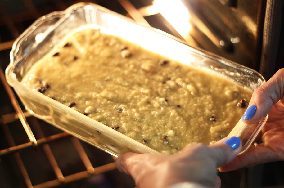 Pour the mixture into the pan and cook at 425° for about an hour, or until a knife comes out cleanly when placed in the center of the loaf. Let it cool for five to ten minutes and enjoy.
