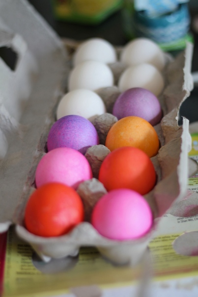 Follow the instructions on the back of the dye box, with a few tweaks. I used a splash more vinegar to make the colors bolder, and I left the eggs in the mixture for 7-9 minutes, depending on the vibrancy of the color.