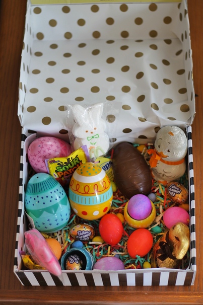 Finally, your basket is complete and you can take some photos to brag to your friends about your DIY prowess before you dig in. I sprinkled some more chocolate eggs among the confetti in the bottom of the box — a small reminder of the egg hunt tradition.